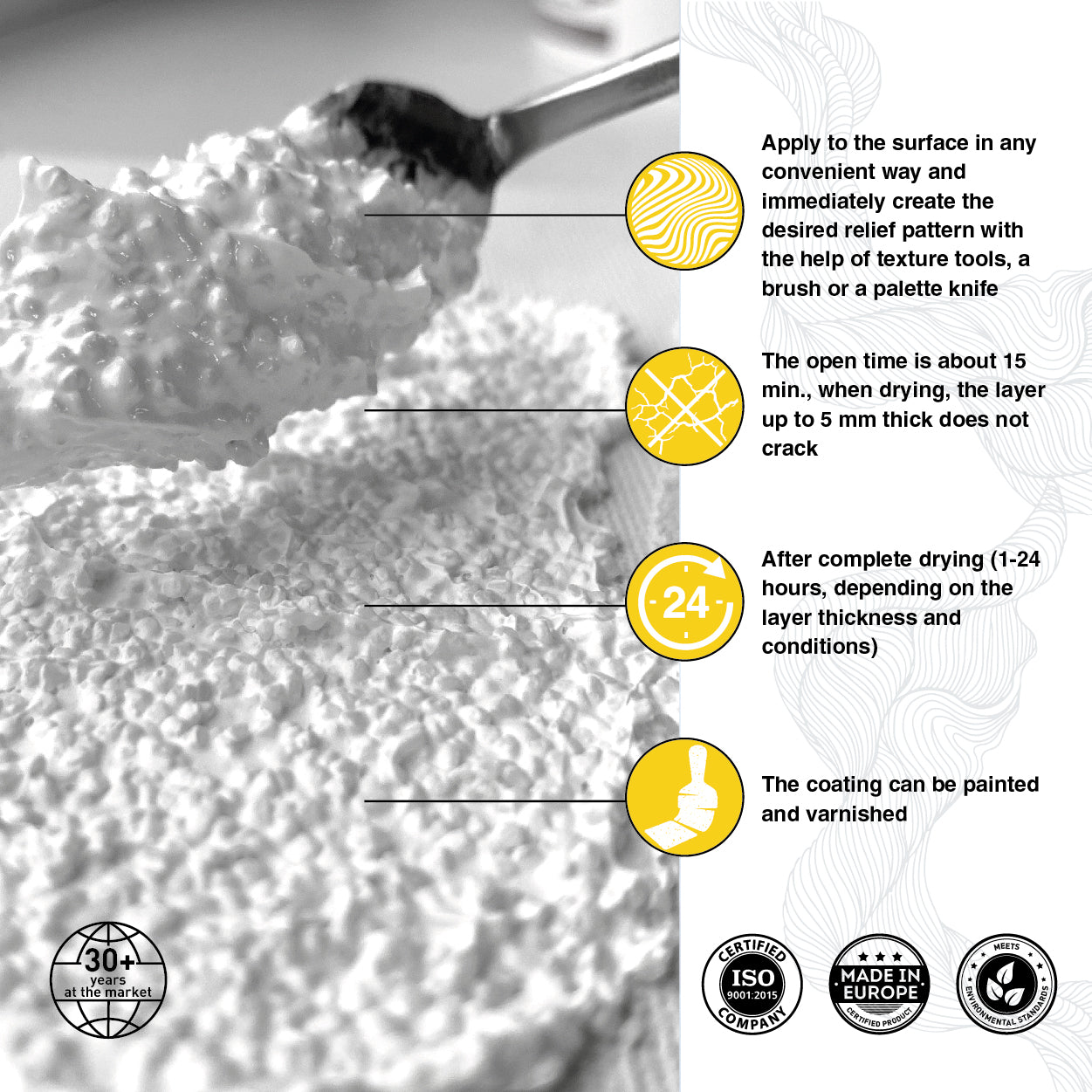 APPLICATION: apply to the durable, clean and dry surface in any convenient way and create the desired relief pattern immediately with an appropriate texture tools, brush or spatula. Open time is about 15 minutes. After complete drying (1 – 24 hours, depending on the layer thickness and conditions), the coating can be painted and varnished.