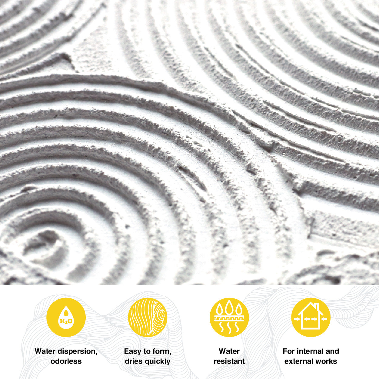 - Latex coarse-grained structural paste for three-dimensional relief design of various durable surfaces. It gives the surface a rough appearance, perfectly hides small irregularities and defects, and is easy to mold. For interior and exterior use.