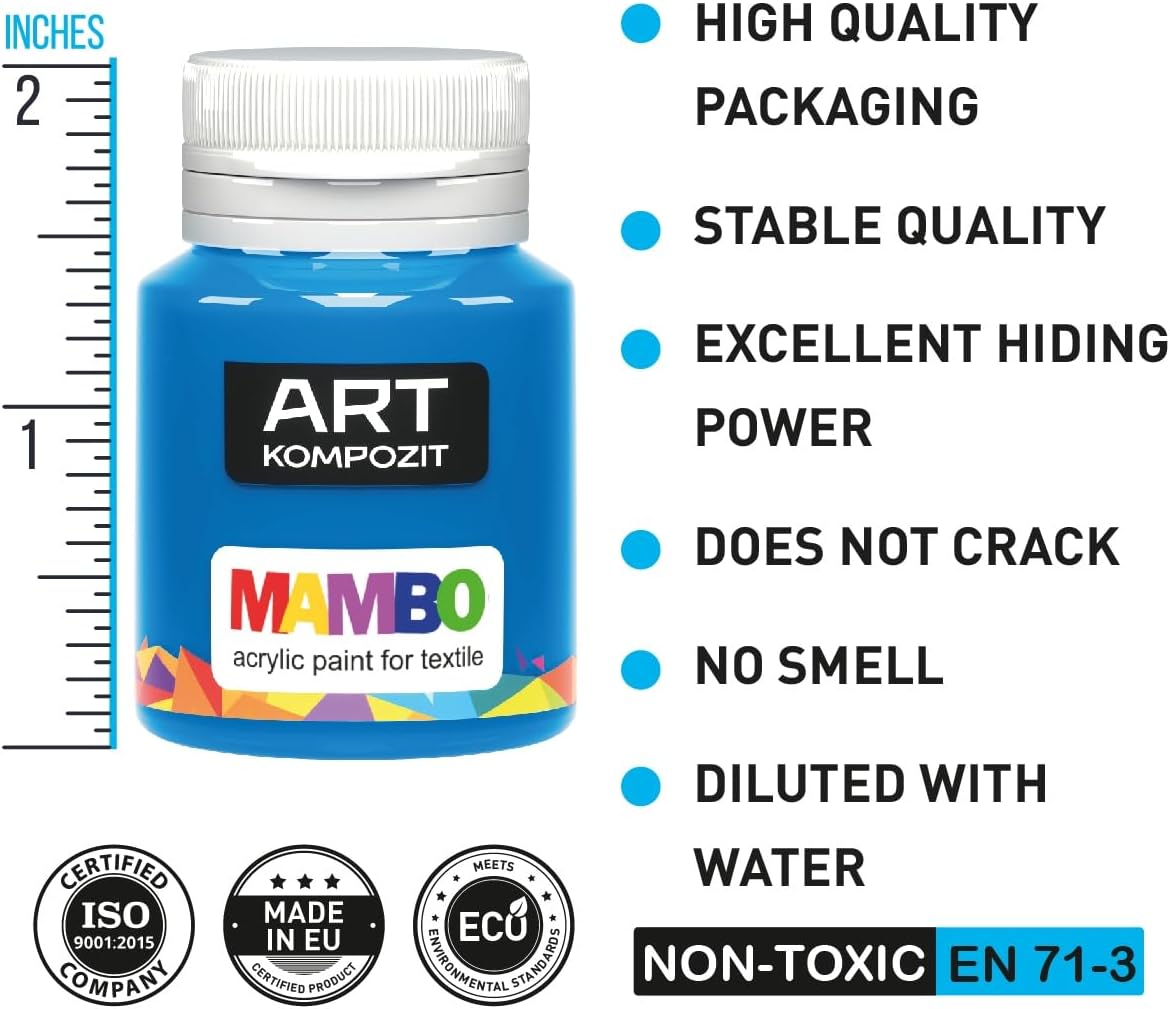 - 🖌️ Premium Quality Pigments - Crafted with high-quality pigments, MAMBO Acrylic Fabric Paints offer superior coverage and brilliant, lasting results on various surfaces. The thick and creamy consistency ensures smooth application, making your creations stand out with vivid and true-to-life colors.
